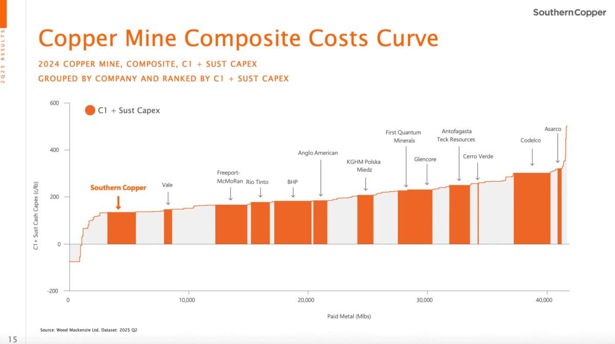 Southern Copper (NYSE:SCCO) has the largest copper reserves of any listed company and the lowest production costs. For anyone optimistic about future demand, that combination’s hard to beat.