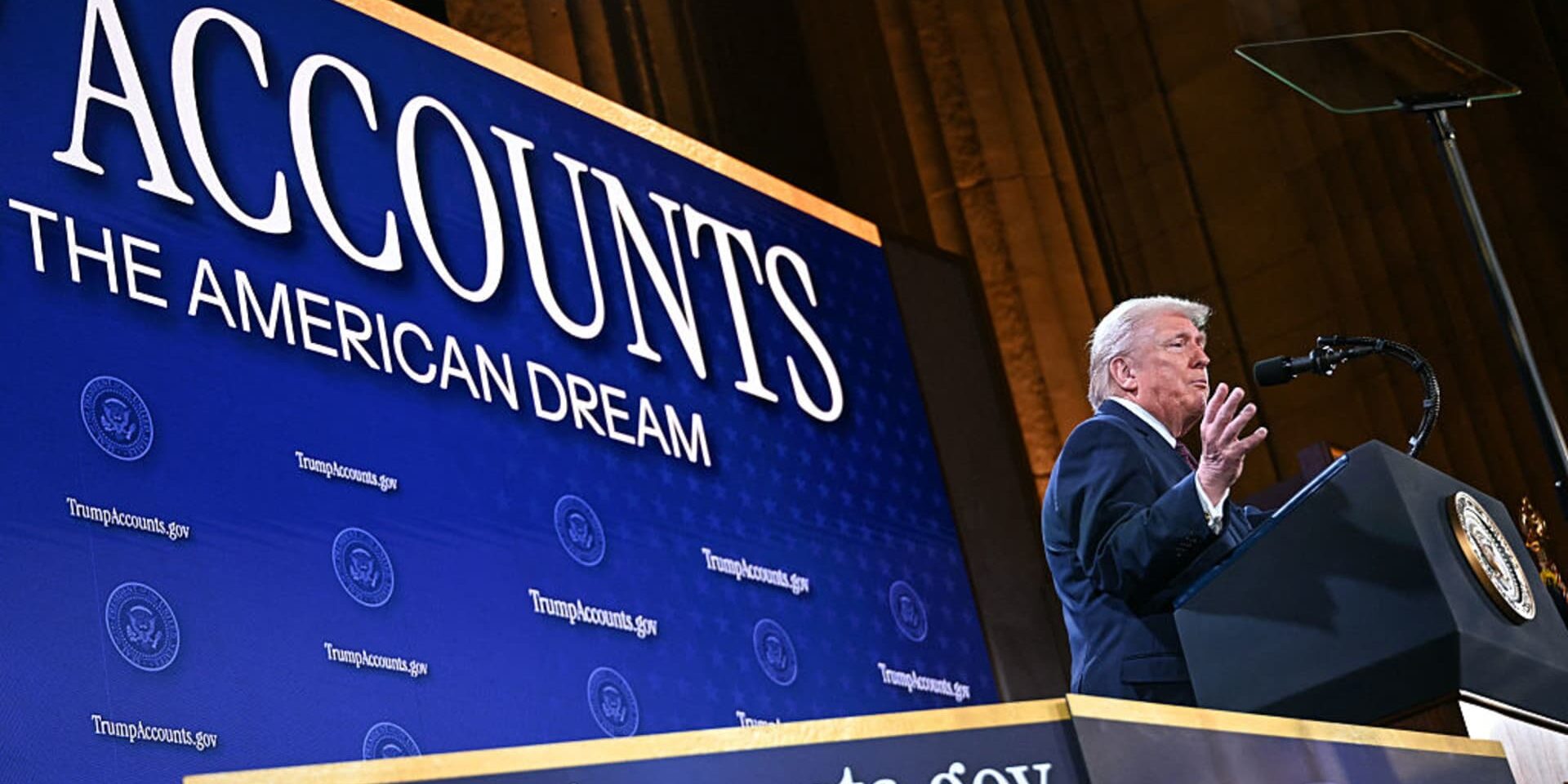 US President Donald Trump delivers remarks on ‘Trump Accounts’ at the Andrew W. Mellon Auditorium in Washington, DC, on Jan. 28, 2026.